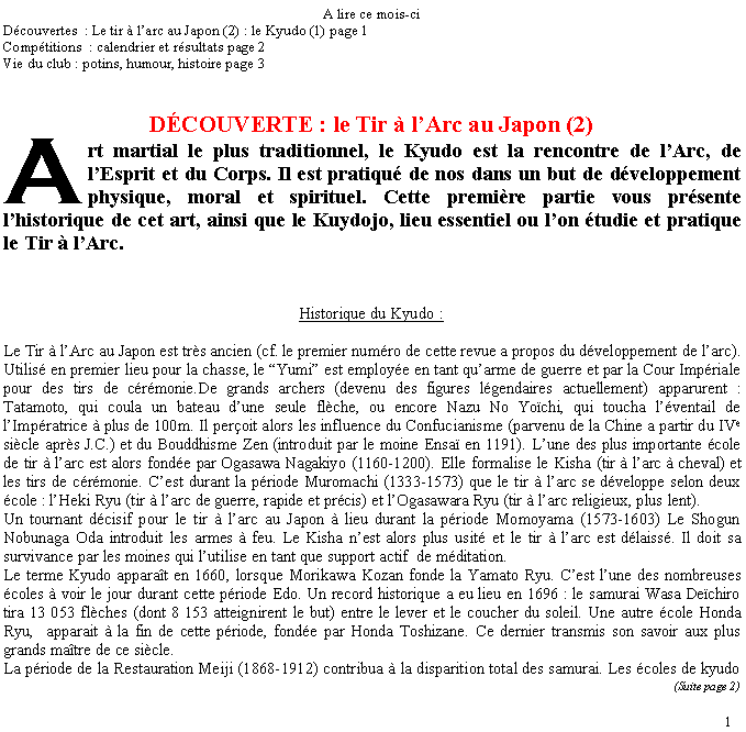 Le précédent numéro vous a plu. Merci pour vos remarques et vos encouragements. Continuons donc sur cette voie avec ce mois-ci la suite du tir à l'arc au Japon, avec la première partie d'un article consacré au Kyudo. Les premiers résultats des concours arrivent ainsi que vos premières contributions à cette revue. Bonne lecture.